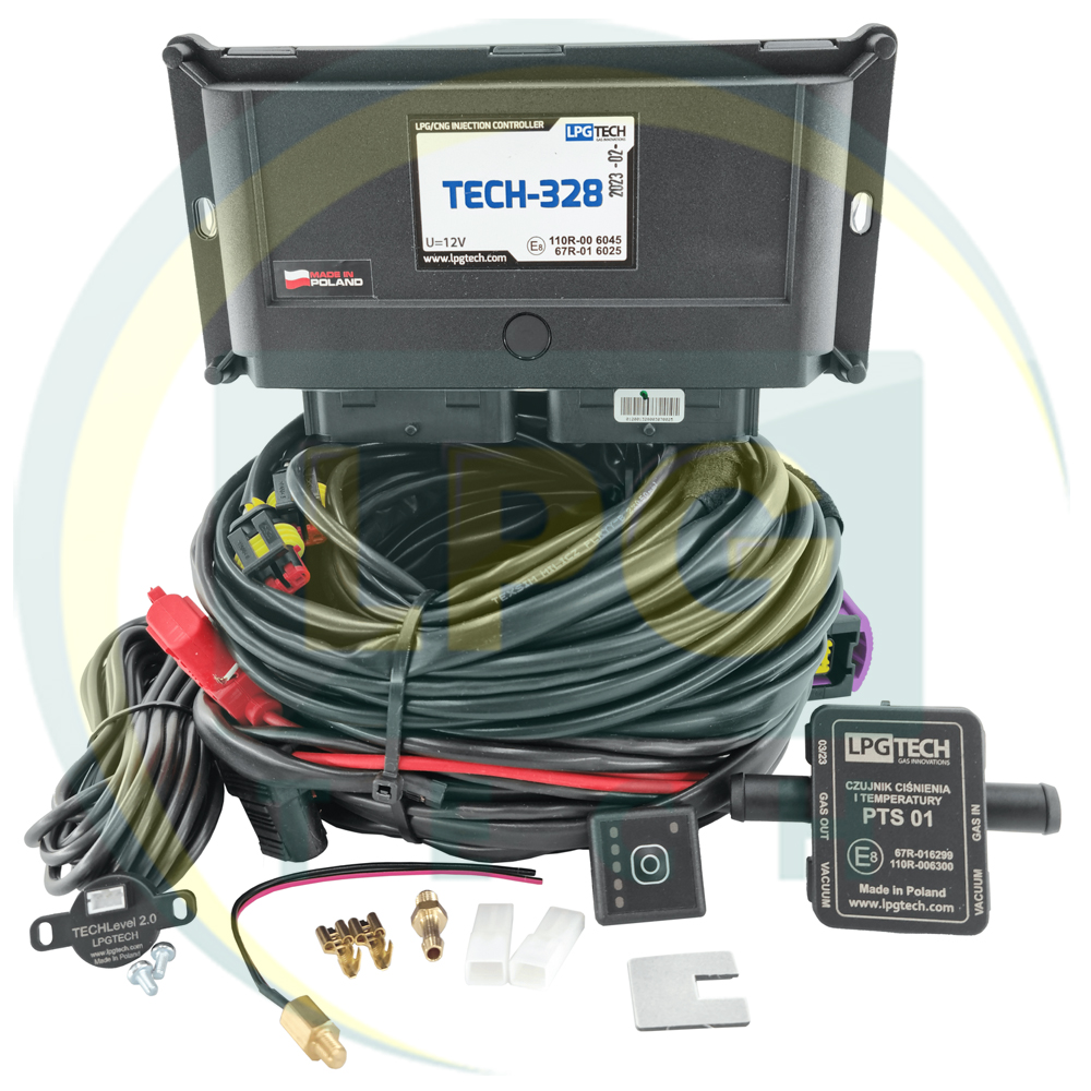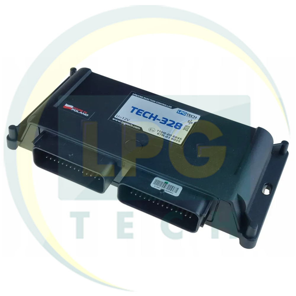 Контролер TECH-328 виконаний з алюмінію, компактний (190х125х30 мм) і ергономічний. Володіє роз'ємом 56 контактів для проводки. Джгут проводки використовують для підключення до бензинових і газових форсунок, для цього тут розташовані роз'єми універсального зразка (без фішок) і Valtek відповідно. МАП-датчик є комбінованим і проводить вимірювання не тільки тиску і вакууму, а й температури газу на рампі форсунок. Кнопка перемикання виду палива оснащена шкалою індикації для підключення до проведення тут є 6-ти контактний роз'єм. Сенсорний датчик працює на ефекті Холла. Для здійснення налаштування і перегляду параметрів знадобиться спеціальний діагностичний модуль. Його ще називають інтерфейс. Підтримуються провідні та бездротові інтерфейси. Для здійснення налаштувань та огляду параметрів підійде ПК, ноутбук, планшетний комп'ютер або смартфон. Існує три конфігураційні програми: