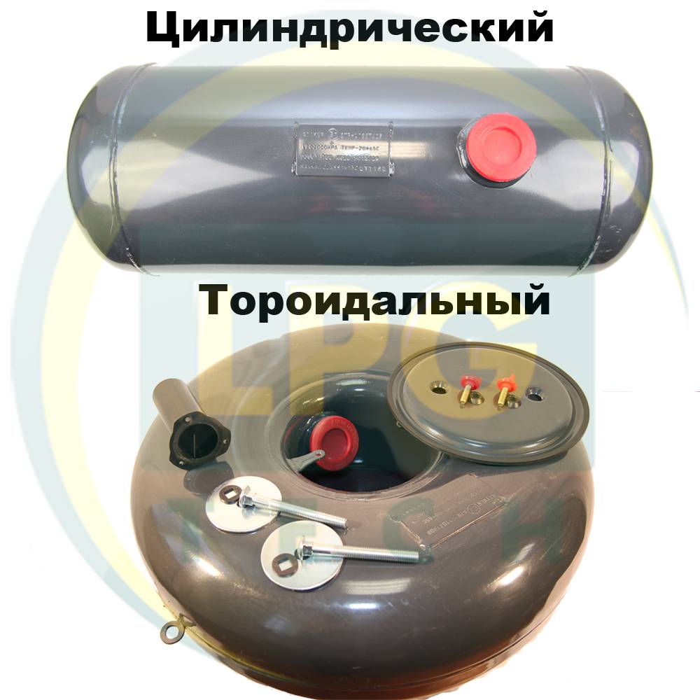 - Газовий автомобільний балон. Тут ви можете обрати один з двох варіантів, який буде найбільш зручний: тороідальний (під запасне колесо 42 літри з внутрішнім розташуванням горловини) або циліндричний – 50 літрів;