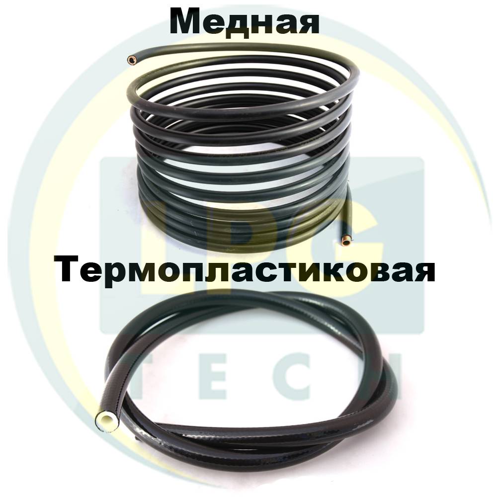 - Заправна відповідає за наповнення балона і з'єднує заправний пристрій та мультиклапан на балоні. Має діаметр 8 мм. Можна обрати один з двох варіантів трубки - це мідна трубка в пластиковому покритті і термопластикова зі штуцерами для з'єднання. В комплектацію буде входити два метри. Магістральний трубопровід пов'язує мультиклапан з підкапотними комплектуючими (редуктори, газовий клапан і т.д.) і служить для передачі пропан-бутану з балона далі по системі. Має діаметр 6 мм, в комплект входитиме шість метрів трубки. Також, як і в ситуації з заправної трубкою, можна обрати один з двох варіантів трубки - це мідна трубка в пластиковому покритті і термопластикова зі штуцерами для з'єднання.