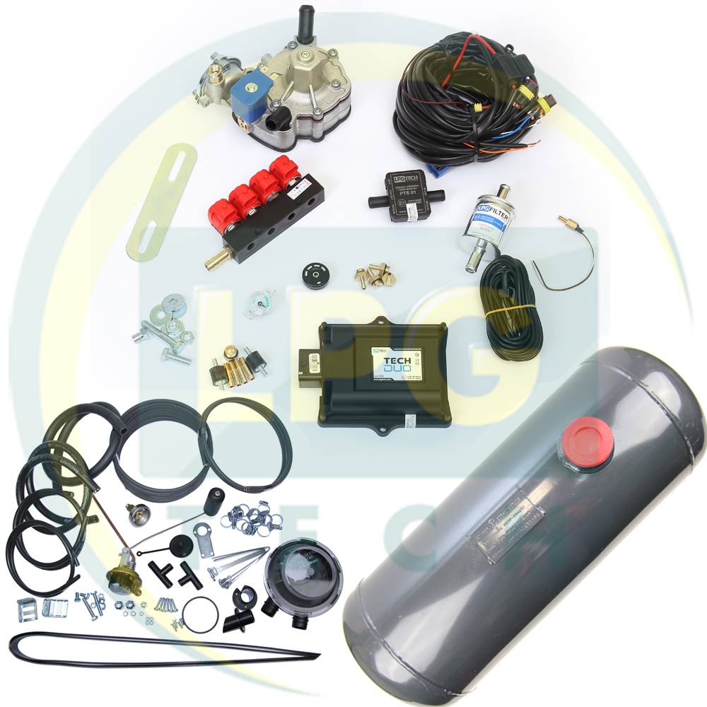 - Система управління уприскуванням палива TECH DUO: електронний блок управління на 4 цил., перемикач, електропроводка на 4 циліндри, датчик PTS-01, штуцер для вакууму, датчик рівня газу, сервісна книжка і монтажний набір;