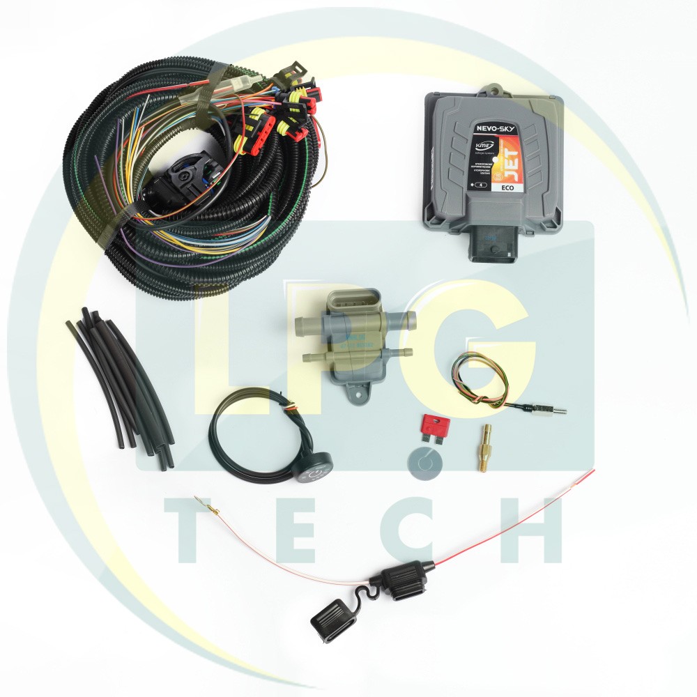 Міні-комплект 4 покоління KME Nevo Sky Jet на ГБО який ви можете придбати на нашому сайті, розрахований на роботу з 4-х циліндровими двигунами з розподільним впорскуванням. Такий набір містить в собі основні елементи котрі потрібні для монтажу в підкапотному просторі, а саме: газові форсунки, випаровувач, інжекторна система, фільтр тонкого очищення й датчик рівня газу на мультиклапан. Тобто в даному комплекті відсутні шланги, трубки, заправний пристрій, балон та мультиклапан. Даний набір має приємну ціну, та досить широкий вибір газових форсунок та редукторів, а також містить деталі котрі допоможуть повністю замінити вам підкапотну частину ГБО. Міні-комплект KME Nevo Sky Jet може знадобитися у випадку, якщо власник авто вирішив переобладнати свій транспорт з другого покоління на четверте, при цьому не чіпаючи трубки, шланги та газовий балон. Сфера застосування комплекту – пропан-бутан (LPG). Гарантія на форсунки та редуктора – 1 рік з моменту придбання. На інжекторну систему гарантія два роки.