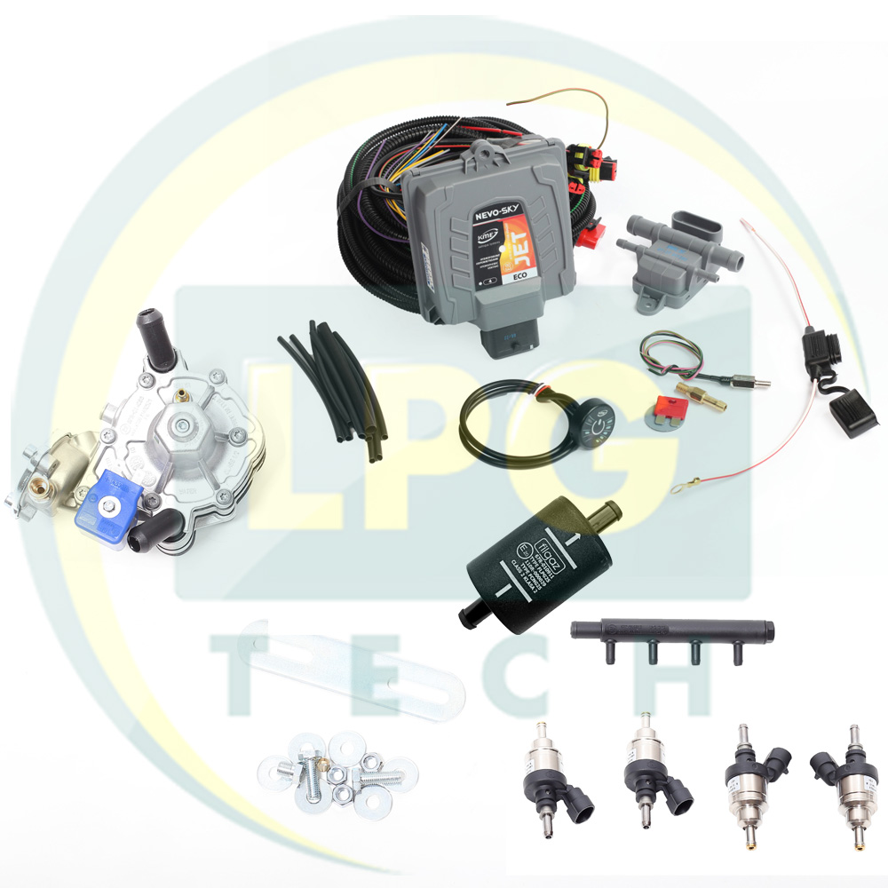 В даний мінікомплект входить також інжекторна система KME Nevo Sky Jet Eco. Дана система є досить практичною та універсальною, адже містить в собі багато корисних функцій, має широкий діапазон корекцій та налаштувань авто при роботі на газовому паливі. Може монтуватися на будь-яке авто розподільного впорскування котре має до 4-х циліндрів включно. Не обладнана вбудованим модулем підключення до OBD.